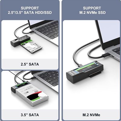 Compatible for different kinds of HDD/SSD in the market, including M-key NVMe SSD,2.5″ SATA HDD/SSD and 3.5″ SATA HDD, can recognize two disks simultaneously when connecting with PC