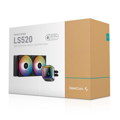 The DeepCool LS520 premium liquid CPU cooler maximizes cooling performance and low-noise efficiency with a 240mm radiator, two FC120 A-RGB PWM fans, and an infinity mirror cap design.