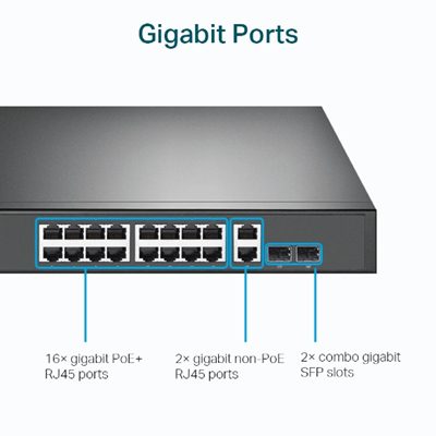 16 x gigabit PoE+ RJ45 ports, 2 x gigabit non-PoE RJ45 ports, and 2x combo gigabit SFP slots