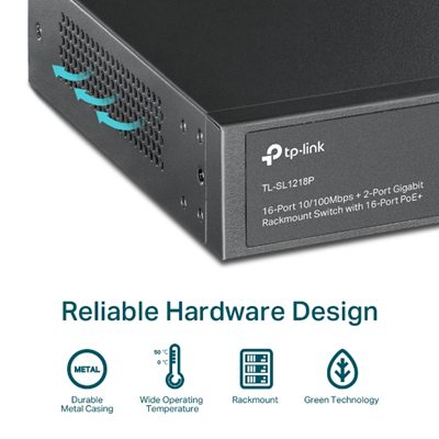 TP-Link TL-SL1218P 16-Port Metal 10/100 Mbps + 2-Port Gigabit Rackmount PoE Switch with 16-Port PoE+ (150W)