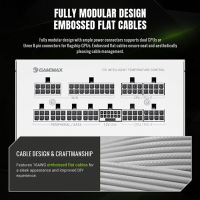 Fully modular design with ample power connectors supports dual CPUs or three 8-pin connectors for flagship GPUs. Embossed flat cables ensure neat and aesthetically pleasing cable management.